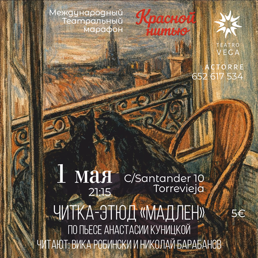 🎭 Завершит первый фестивальный день читка-этюд маленькой пьесы для двух комедиантов и одного кота «МАДЛЕН» (театр «ВЕГА», Торревьеха). По окончании приглашаем на обсуждение, в котором примут участие исполнители и автор пьесы Анастасия Куницкая.